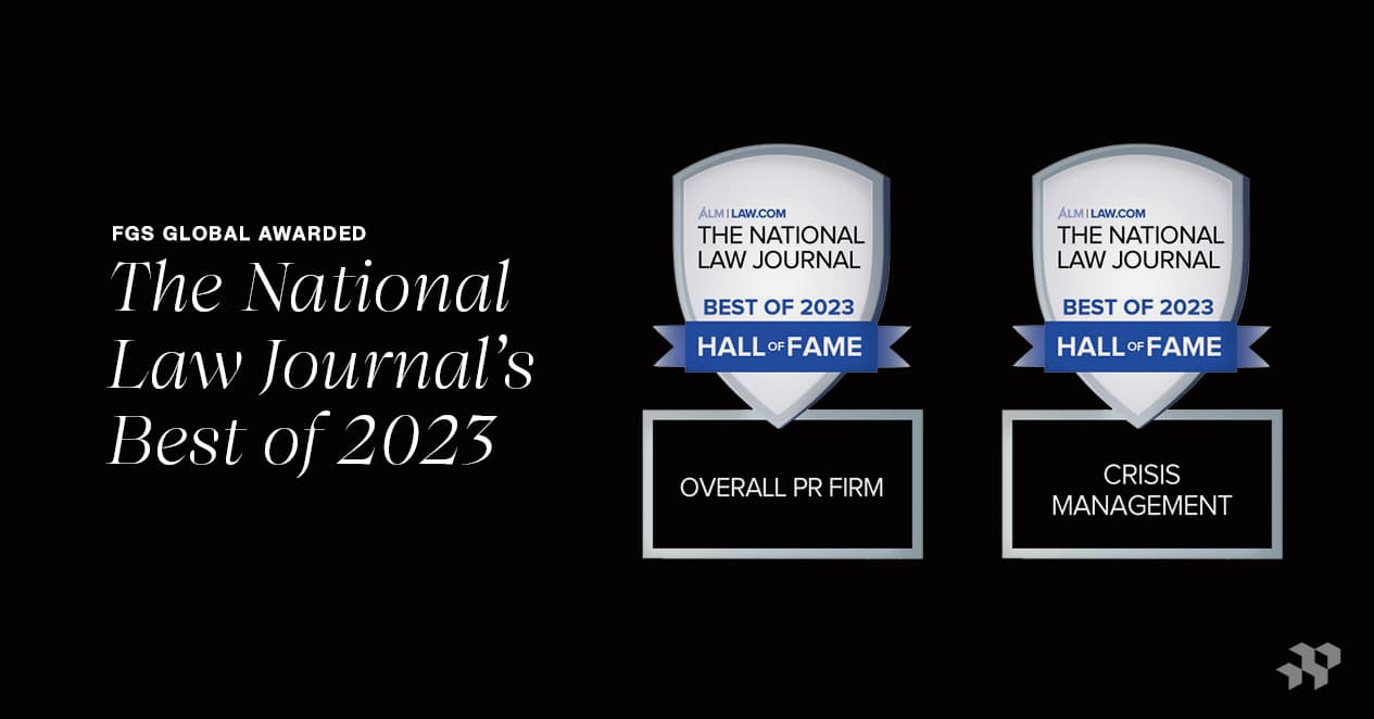 FGS Global has once again been named to the “Hall of Fame” in the National Law Journal’s “Best of 2023” awards in “Crisis Management” and “Overall PR Firm” categories. This is the fifth year in a row that we’ve been ranked in the top three for both categories, and the third consecutive year we’ve been named to the NLJ’s “Hall of Fame” for our consistent recognition in these rankings.