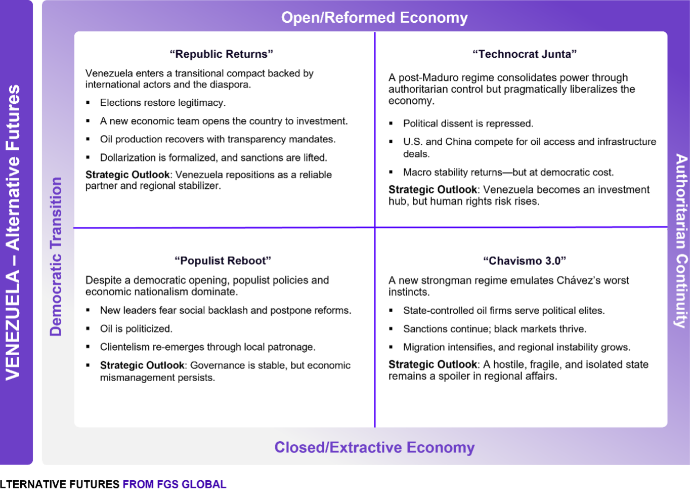 Decision-makers should prepare for a range of plausible futures shaped by two interlocking uncertainties: the nature of Venezuela's political governance and whether it trends toward authoritarian continuity or democratic transition; and the direction of its economic policy and whether it remains closed and extractive or opens toward reform and reintegration.